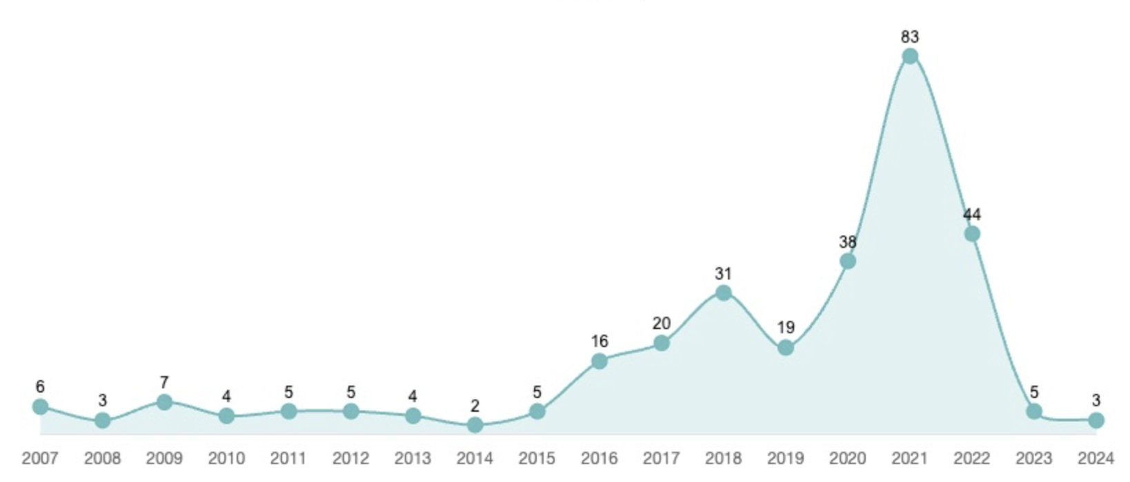 2022 年虽仍有 44 个新帐号,但相比峰值明显下降。