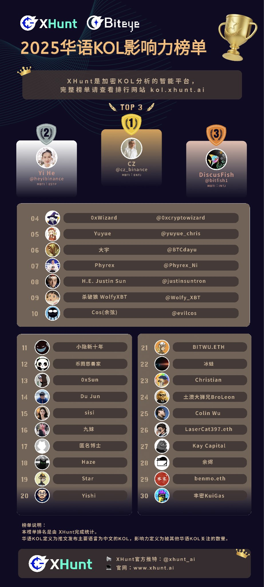 为此,XHunt 与 Biteye 联合发布这份《华语 KOL 影响力图鉴》,试图釐清他们在加密生态中的真实角色、演变路径与经济模型,并通过资料与访谈,呈现一幅属于中文语境的「KOL 图谱」。
