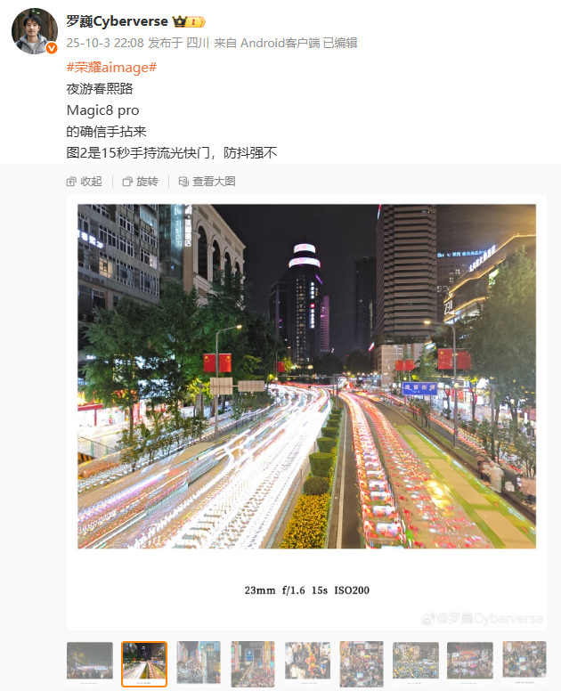 alixixi 10 月 4 日消息,荣耀首席影像工程师罗巍昨晚在微博分享了 Magic8 Pro 手机的拍摄样张,其中包括“15 秒手持流光快门”的样张,并询问网友“防抖强不”。