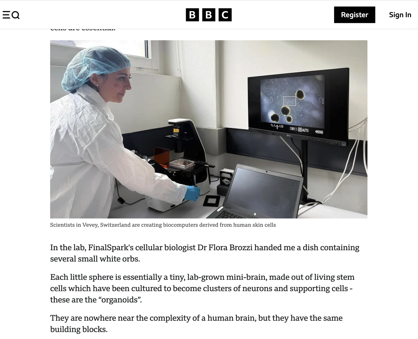 FinalSpark 细胞生物学家 Flora Brozzi 博士提供了一个培养皿,里面是几个白色小球 —— 这些就是由干细胞培养成神经元和支持细胞的“迷你大脑”。其远不及人脑复杂,但拥有相同的基本构成。经过几个月处理后,类器官就能接上电极,对简单的键盘指令作出反应。