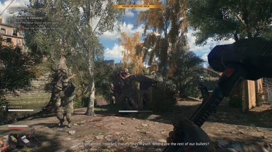 这一代依旧可以地形杀,楼上有一个背对我们的丧尸,可以直接按E踹它下去。