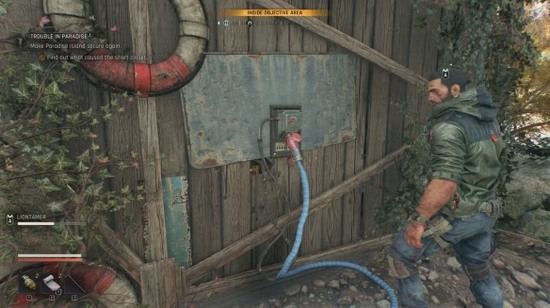然而电源线被怪物扯烂了,我们要重新接线。和墙壁上的电箱互动,我们可以把线缆拽在身上。