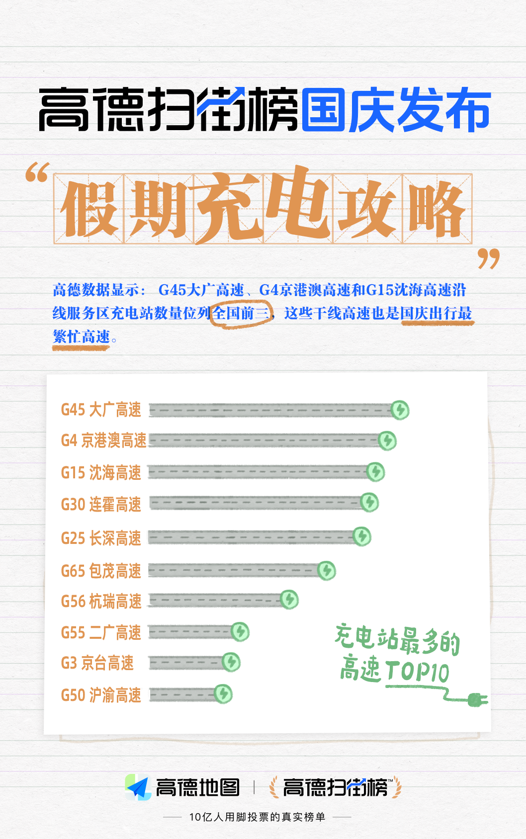 高德地图在线全国公共充电站总量已达到 30 多万座。全国服务区内充电站数量 TOP5 的省份是:广东、河南、浙江、河北、安徽。G45 大广高速、G4 京港澳高速和 G15 沈海高速沿线服务区充电站数量位列全国前三,这些干线高速也是国庆出行最繁忙高速。