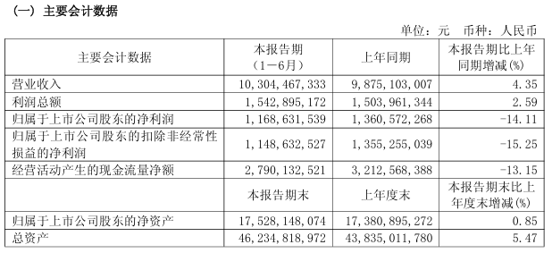春秋航空财报显示,2025 年上半年,公司实现营业收入 103.04 亿元,同比增长 4.35%;归母净利润 11.69 亿元,同比下降 14.11%。