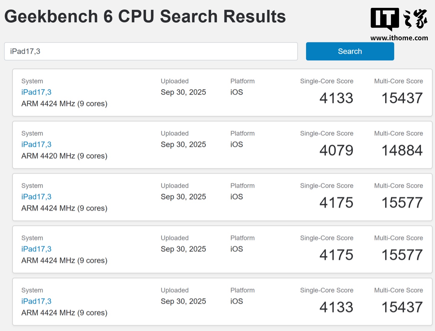 alixixi 10 月 6 日消息,科技媒体 bleepingcomputer 昨日(10 月 5 日)发布博文,报道称在 GeekBench 跑分库上出现了 iPad17,3 的踪迹,预估为 M5 iPad Pro,共有 5 条记录,按照多核最高分排序,得分最高的一条记录单核 4175 分,多核 15577 分。