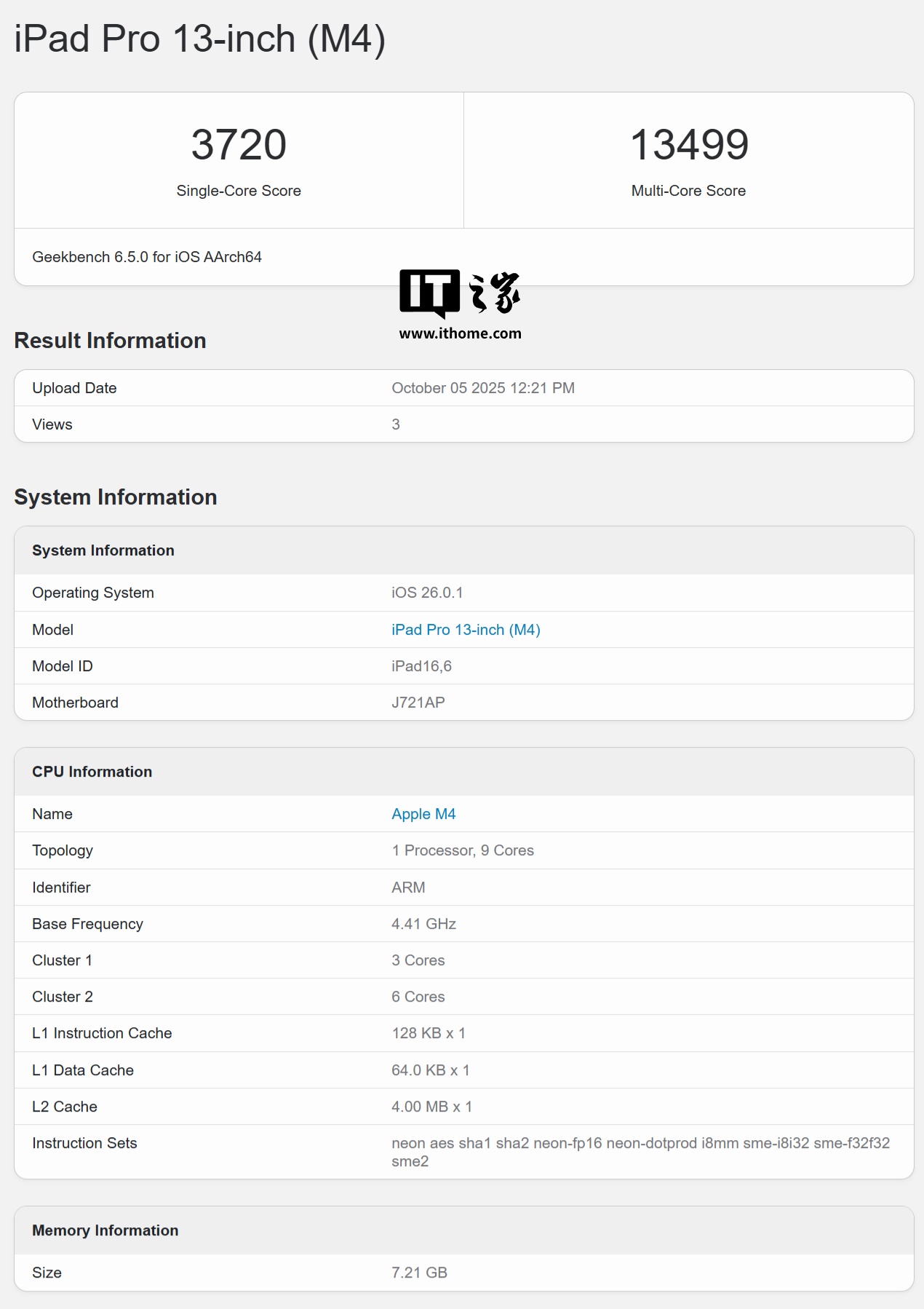 相比较而言,苹果 M4 iPad Pro 的单核成绩为 3720 分,多核成绩为 13499 分。