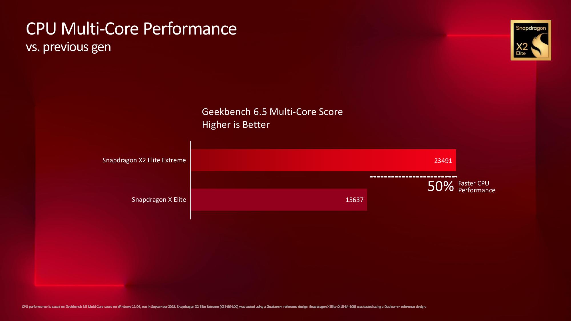 作为对比,该媒体对比了高通骁龙 X2 Elite Extreme 芯片,骁龙芯片的单核成绩约为 4080 分,多核成绩则高达 23491 分。