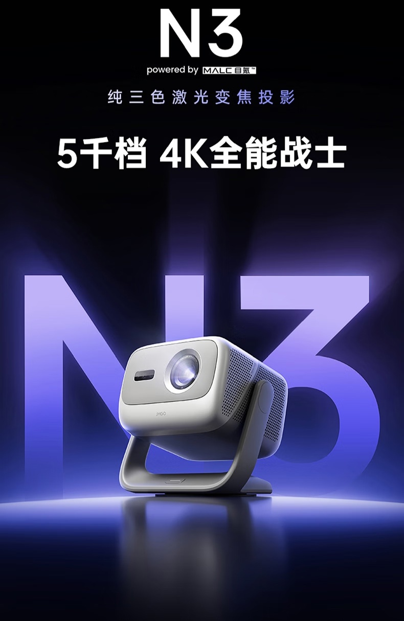 坚果 N3 搭载联发科 MT9 系列旗舰芯片,配备 4GB 内存 + 32GB 机身存储,采用 MALC 目氪 3.0 纯三色激光光源,具备 3840*2160 分辨率和 240Hz 刷新率,支持 4K 光学变焦,亮度可达 1700 lm,支持 MEMC 运动补偿。