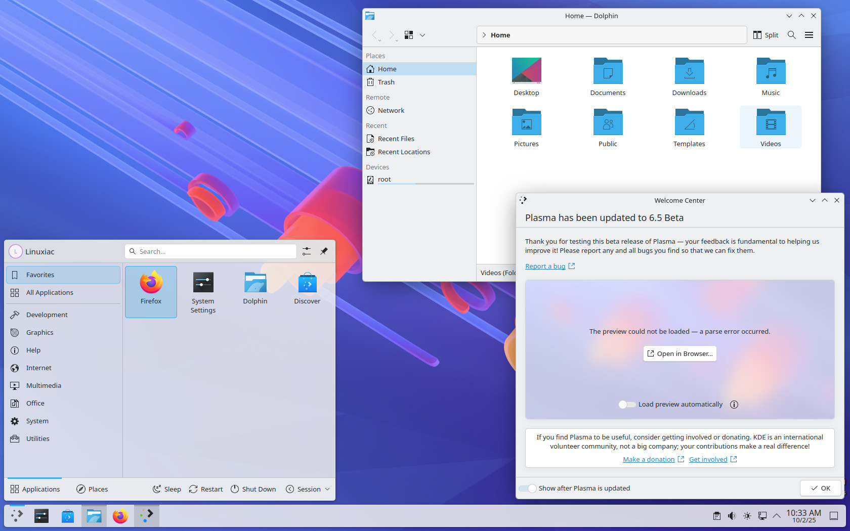 在视觉设计方面,最显著的变化之一提升了整体美感,采用 Breeze 主题的无边框窗口,增加了圆润的底部边角。此外,Plasma 6.5 还引入了全局主题与壁纸的日夜模式自动切换功能,并允许用户为动态壁纸优先选择浅色或深色变体。