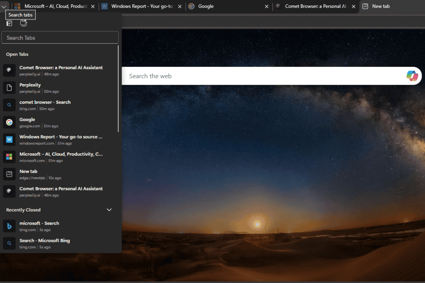 微软官方表示,这项更新旨在帮助用户保持浏览器界面的整洁有序。“标签搜索”不仅让用户能快速查找并重新打开最近关闭的标签页,还能在单一视图中搜索所有已打开的页面。