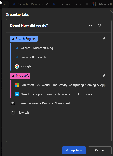 值得注意的是,这一入口位置与谷歌 Chrome 浏览器的标签搜索按钮完全相同,这样的设计使得习惯使用 Chrome 的用户在切换到 Edge 后几乎没有学习成本,可以立刻上手。单击图标后,所有搜索和组织选项都会集中显示在当前窗口内。