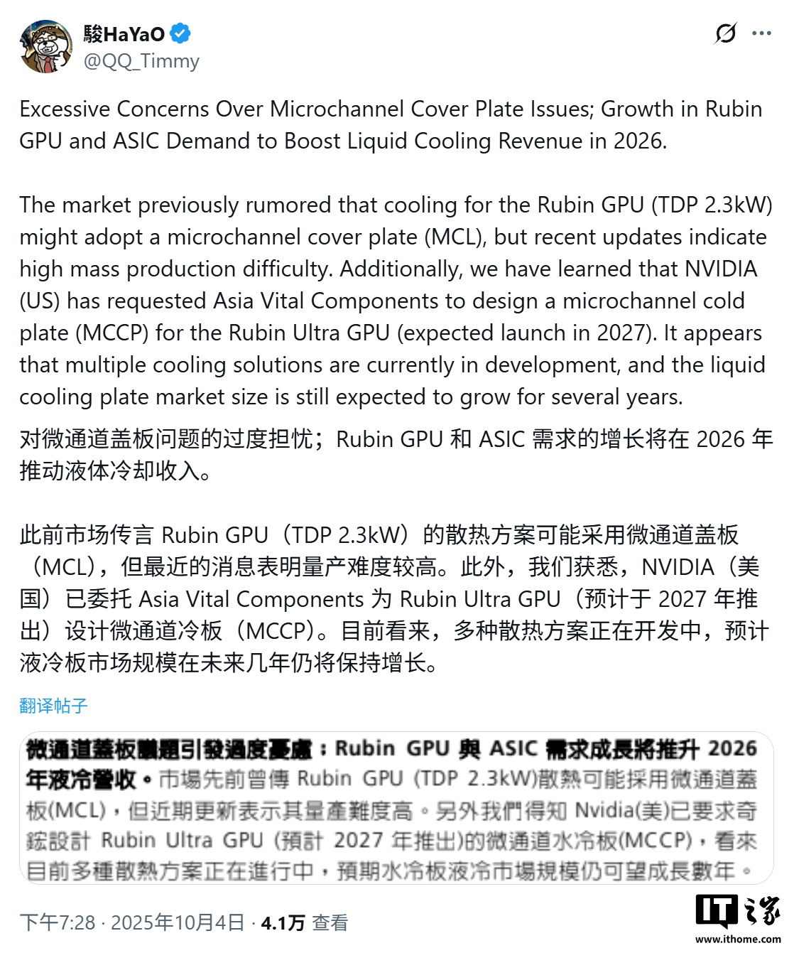 消息称,英伟达已接触散热解决方案供应商奇鋐科技(Asia Vital Components,AVC),为其 Rubin Ultra GPU 设计并制造微通道冷板。该技术原计划可能用于标准版 Rubin GPU,但因开发周期紧张,供应商没有足够时间完成切换。