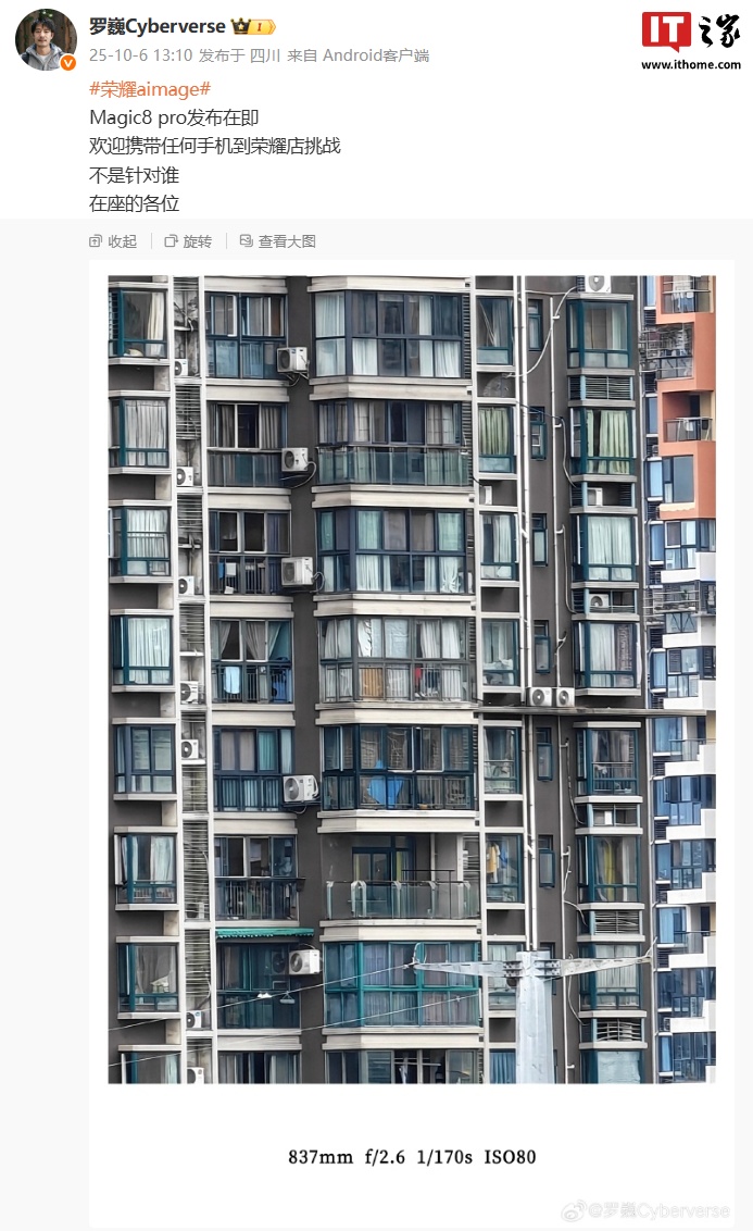 alixixi 10 月 6 日消息,荣耀首席影像工程师罗巍今日发文称,Magic8 Pro 发布在即,欢迎携带任何手机到荣耀店挑战。他表示“不是针对谁 在座的各位”。值得一提的是,罗巍微博的话题为“荣耀 aimage”,暗指荣耀 Magic8 Pro 手机在影像上有所突破。
