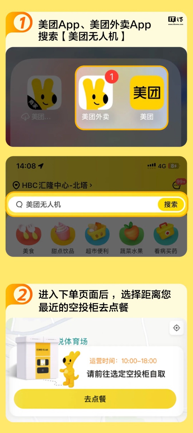 具体下单流程方面,用户可以前往美团 App / 美团外卖 App 搜索“美团无人机”,进入下单页面后,选择最近的空投柜点餐,之后即可结算下单取件。