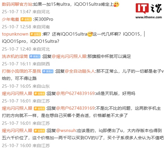 有用户询问“是买 X9U 还是买 iq15U?”,博主回复“两个方向吧,另外再强调一遍,iQOO 15U 是待定状态,内部没有彻底确定上,即便上也是明年上半年 ”。结合评论区讨论来看,博主此处所指的 iQOO 15U 有望为 iQOO 15 Ultra 机型。