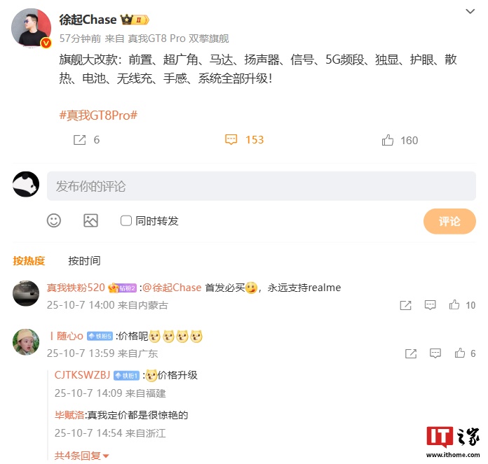 alixixi 10 月 7 日消息,真我 realme 副总裁、全球营销总裁、中国区总裁徐起今日发文预热真我 GT8 Pro 手机,他称该机定位“性能影像双擎旗舰”,拥有性能旗舰才有的骁龙旗舰电竞双芯和 2K 直屏,同时拥有性能旗舰没有的 2 亿潜望长焦,是目前行业唯一的骁龙 8 至尊 5 + 2K 直屏 + 2 亿长焦组合。