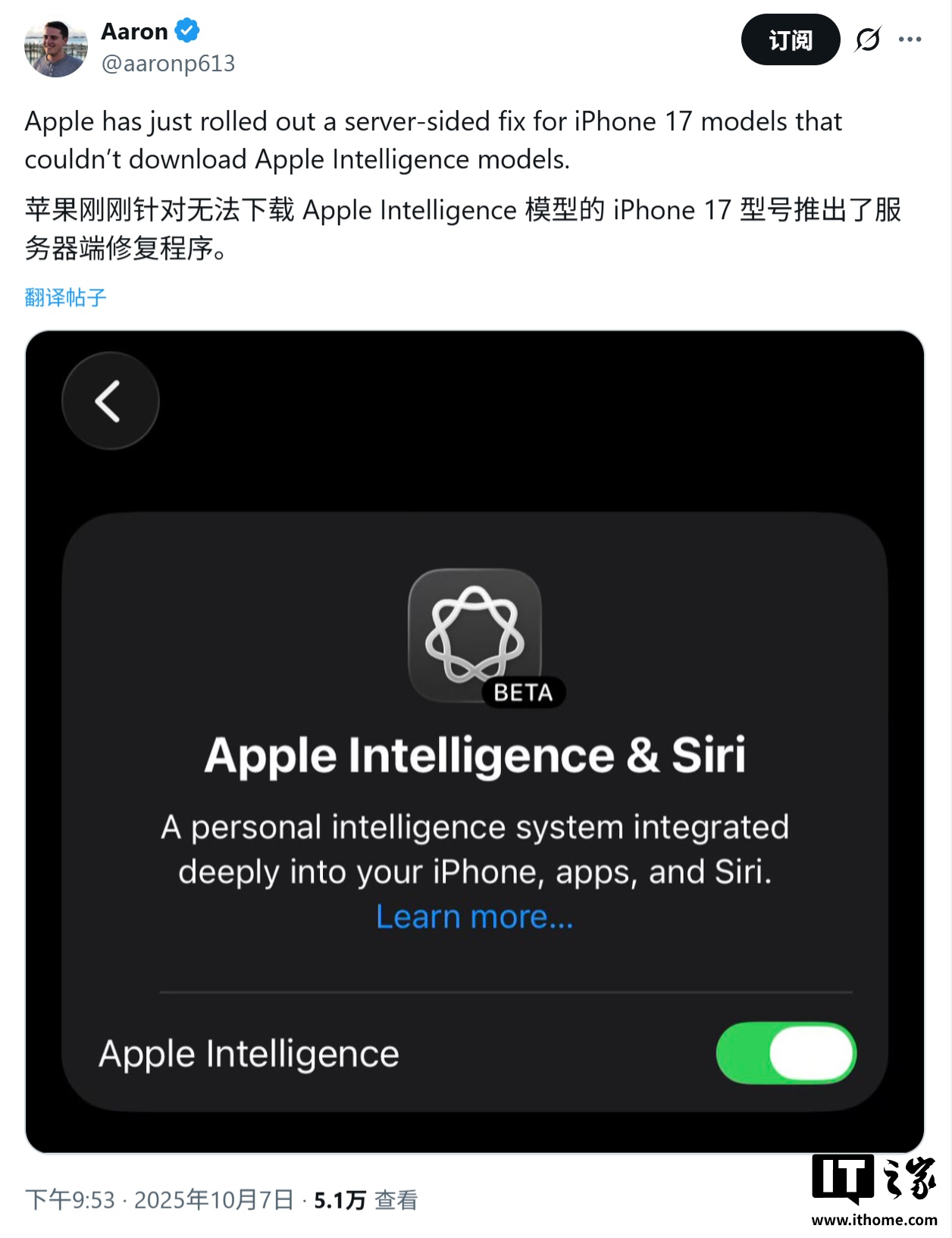 alixixi 10 月 8 日消息,科技媒体 9to5Mac 昨日(10 月 7 日)发布博文,报道称苹果通过服务器端更新,修复了少数 iPhone 17、iPhone Air、iPhone 17 Pro 和 iPhone 17 Pro Max 用户无法下载 Apple 智能(Apple Intelligence)模型的问题。