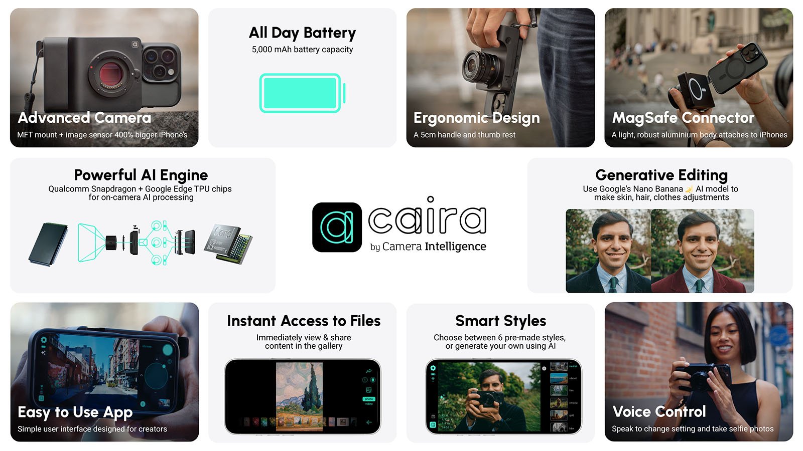 alixixi 10 月 8 日消息,科技媒体 petapixel 昨日(10 月 7 日)发布博文,报道称 Camera Intelligence 公司专为苹果 iPhone,设计了名为 Caira 的相机配件,融合专业摄影和 AI 便捷性,将于 10 月 30 日登陆 Kickstarter,早鸟价 695 美元(alixixi注:现汇率约合 4958 元人民币),预计 2026 年 1 月正式发售。
