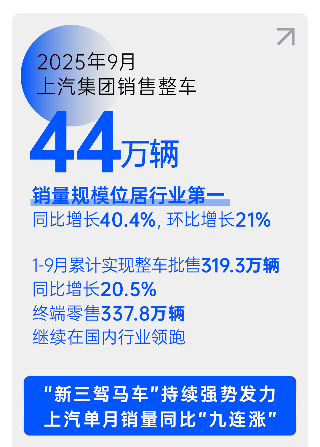 alixixi 10 月 8 日消息,上汽集团今天发布 2025 年 9 月产销快报,本月销售整车 44 万辆,同比增长 40.4%,环比增长 21%,销量规模位居行业第一。