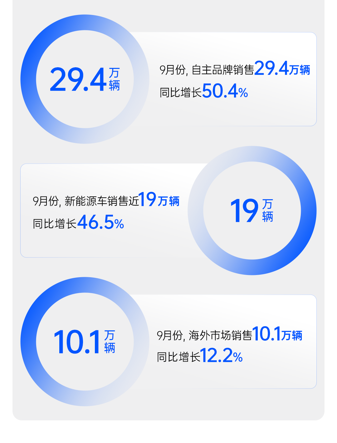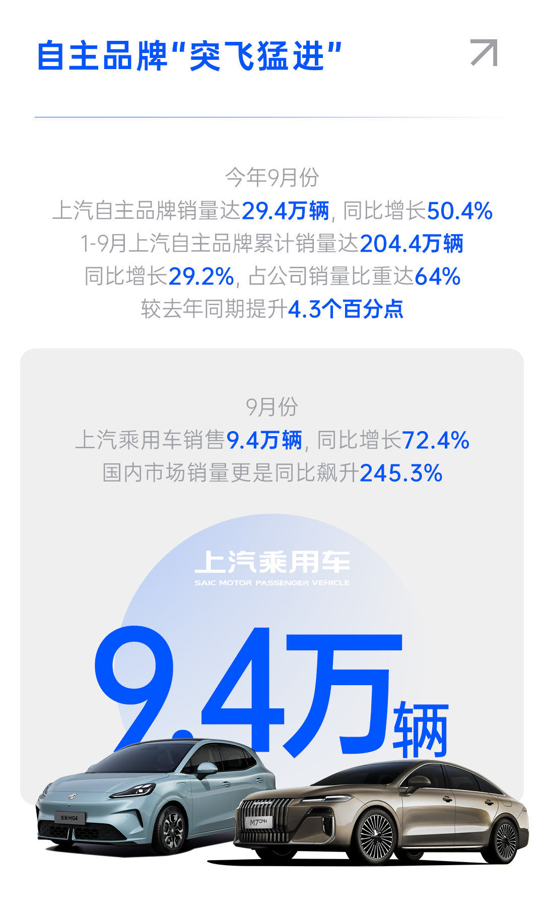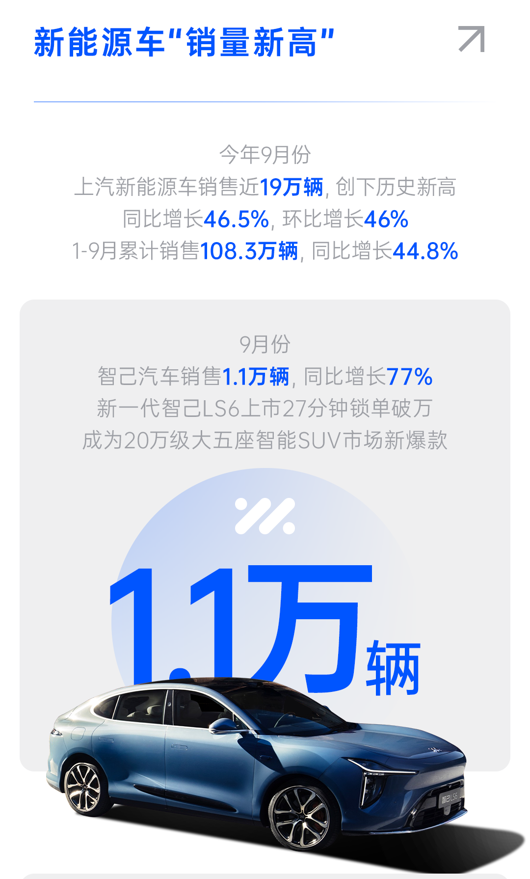今年 9 月份,上汽自主品牌销售 29.4 万辆,同比增长 50.4%。alixixi从官方获悉,其中新能源车销售近 19 万辆,同比增长 46.5%。