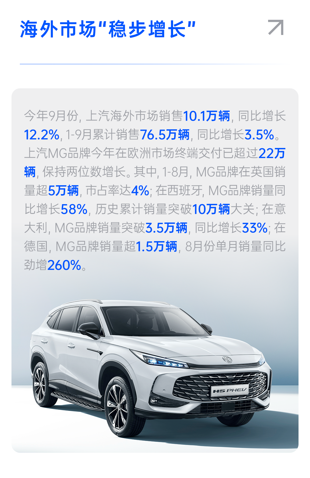 出口方面,今年 9 月份,上汽海外市场销售 10.1 万辆,同比增长 12.2%,1-9 月累计销售 76.5 万辆,同比增长 3.5%。上汽 MG 品牌今年在欧洲市场终端交付已超过 22 万辆,保持两位数增长。
