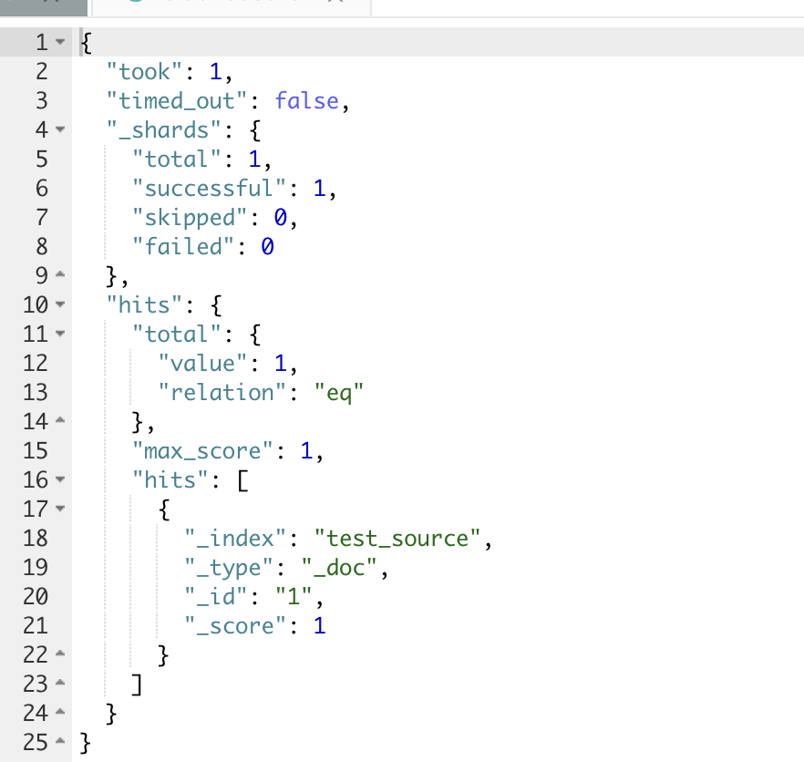 # 1. 创建不带source的双字段索引PUT test_source{ "mappings": { "_source": { "enabled": false }, "properties": { "msg": { "type": "text", "fields": { "keyword": { "ignore_above": 256, "type": "keyword" } } } } }}# 2. 写入测试数据POST test_source/_doc/1{"msg":"""[08-27 14:28:45] [DBG] [config.go:273] config contain variables, try to parse with environments[08-27 14:28:45] [DBG] [config.go:214] load config files: [][08-27 14:28:45] [INF] [pipeline.go:419] creating pipeline: pipeline_logging_merge[08-27 14:28:45] [INF] [pipeline.go:419] creating pipeline: ingest_pipeline_logging[08-27 14:28:45] [INF] [pipeline.go:419] creating pipeline: async_messages_merge[08-27 14:28:45] [INF] [pipeline.go:419] creating pipeline: metrics_merge[08-27 14:28:45] [INF] [pipeline.go:419] creating pipeline: request_logging_merge[08-27 14:28:45] [INF] [pipeline.go:419] creating pipeline: ingest_merged_requests[08-27 14:28:45] [INF] [pipeline.go:419] creating pipeline: async_ingest_bulk_requests[08-27 14:28:45] [INF] [module.go:159] started module: pipeline[08-27 14:28:45] [DBG] [module.go:163] all system module are started[08-27 14:28:45] [DBG] [floating_ip.go:348] setup floating_ip, root privilege are required[08-27 14:28:45] [DBG] [queue_config.go:121] init new queue config:e60457c6eae50a4eabbb62fc1001dccc,bulk_requests[08-27 14:28:45] [DBG] [queue_config.go:121] init new queue config:e60457c6eae50a4eabbb62fc1001dccc,bulk_requests[08-27 14:28:45] [DBG] [queue_config.go:121] init new queue config:e60457c6eae50a4eabbb62fc1001dccc,bulk_requests[08-27 14:28:45] [DBG] [processor.go:139] generated new processors: indexing_merge[08-27 14:28:45] [DBG] [pipeline.go:466] processing pipeline_v2: metrics_merge[08-27 14:28:45] [DBG] [processor.go:139] generated new processors: when[08-27 14:28:45] [DBG] [pipeline.go:466] processing pipeline_v2: ingest_merged_requests[08-27 14:28:45] [DBG] [processor.go:139] generated new processors: indexing_merge[08-27 14:28:45] [DBG] [pipeline.go:466] processing pipeline_v2: request_logging_merge[08-27 14:28:45] [DBG] [processor.go:139] generated new processors: indexing_merge[08-27 14:28:45] [DBG] [pipeline.go:466] processing pipeline_v2: async_messages_merge[08-27 14:28:45] [DBG] [processor.go:139] generated new processors: bulk_indexing[08-27 14:28:45] [DBG] [pipeline.go:466] processing pipeline_v2: ingest_pipeline_logging[08-27 14:28:45] [DBG] [queue_config.go:121] init new queue config:1216c96eb876eee5b177d45436d0a362,gateway-pipeline-logs[08-27 14:28:45] [DBG] [processor.go:139] generated new processors: bulk_indexing[08-27 14:28:45] [DBG] [processor.go:139] generated new processors: indexing_merge[08-27 14:28:45] [DBG] [pipeline.go:466] processing pipeline_v2: pipeline_logging_merge[08-27 14:28:45] [DBG] [pipeline.go:466] processing pipeline_v2: async_ingest_bulk_requests[08-27 14:28:45] [DBG] [badger.go:110] init badger database [queue_consumer_commit_offset][08-27 14:28:45] [INF] [floating_ip.go:290] floating_ip entering standby mode[08-27 14:28:45] [DBG] [badger.go:110] init badger database [dis_locker][08-27 14:28:45] [DBG] [time.go:208] refresh low precision time in background[08-27 14:28:45] [DBG] [domain_actions.go:278] elasticsearch metadata [backup] was not found[08-27 14:28:45] [DBG] [bulk_indexing.go:355] metadata for [backup] is nil[08-27 14:28:50] [INF] [module.go:178] started plugin: floating_ip[08-27 14:28:50] [INF] [module.go:178] started plugin: force_merge[08-27 14:28:50] [DBG] [network.go:78] network io stats will be included for map[][08-27 14:28:50] [INF] [module.go:178] started plugin: metrics[08-27 14:28:50] [INF] [module.go:178] started plugin: statsd[08-27 14:28:50] [DBG] [entry.go:100] reuse port 0.0.0.0:7005[08-27 14:28:50] [DBG] [metrics.go:205] collecting network metrics[08-27 14:28:50] [DBG] [metrics.go:174] collecting instance metrics[08-27 14:28:50] [DBG] [elasticsearch.go:128] init elasticsearch proxy instance: prod[08-27 14:28:50] [DBG] [filter.go:103] generated new filters: when, elasticsearch[08-27 14:28:50] [DBG] [entry.go:142] apply filter flow: [*] [/_bulk] [ filters ][08-27 14:28:50] [DBG] [entry.go:142] apply filter flow: [*] [/{any_index}/_bulk] [ filters ][08-27 14:28:50] [DBG] [elasticsearch.go:128] init elasticsearch proxy instance: prod[08-27 14:28:50] [DBG] [filter.go:103] generated new filters: request_path_limiter, elasticsearch[08-27 14:28:50] [INF] [module.go:178] started plugin: gateway[08-27 14:28:50] [DBG] [module.go:182] all user plugin are started[08-27 14:28:50] [INF] [module.go:184] all modules are started[08-27 14:28:50] [INF] [app.go:556] gateway is up and running now.[08-27 14:28:50] [DBG] [domain_actions.go:278] elasticsearch metadata [backup] was not found[08-27 14:28:50] [DBG] [bulk_indexing.go:355] metadata for [backup] is nil[08-27 14:28:55] [DBG] [domain_actions.go:278] elasticsearch metadata [backup] was not found[08-27 14:28:55] [DBG] [bulk_indexing.go:355] metadata for [backup] is nil[08-27 14:29:00] [DBG] [metrics.go:205] collecting network metrics[08-27 14:29:00] [DBG] [metrics.go:174] collecting instance metrics[08-27 14:29:00] [DBG] [domain_actions.go:278] elasticsearch metadata [backup] was not found[08-27 14:29:00] [DBG] [bulk_indexing.go:355] metadata for [backup] is nil[08-27 14:29:05] [DBG] [domain_actions.go:278] elasticsearch metadata [backup] was not found[08-27 14:29:05] [DBG] [bulk_indexing.go:355] metadata for [backup] is nil[08-27 14:29:10] [DBG] [metrics.go:205] collecting network metrics[08-27 14:29:10] [DBG] [metrics.go:174] collecting instance metrics[08-27 14:29:10] [DBG] [domain_actions.go:278] elasticsearch metadata [backup] was not found"""}# 3. 查询数据GET test_source/_search