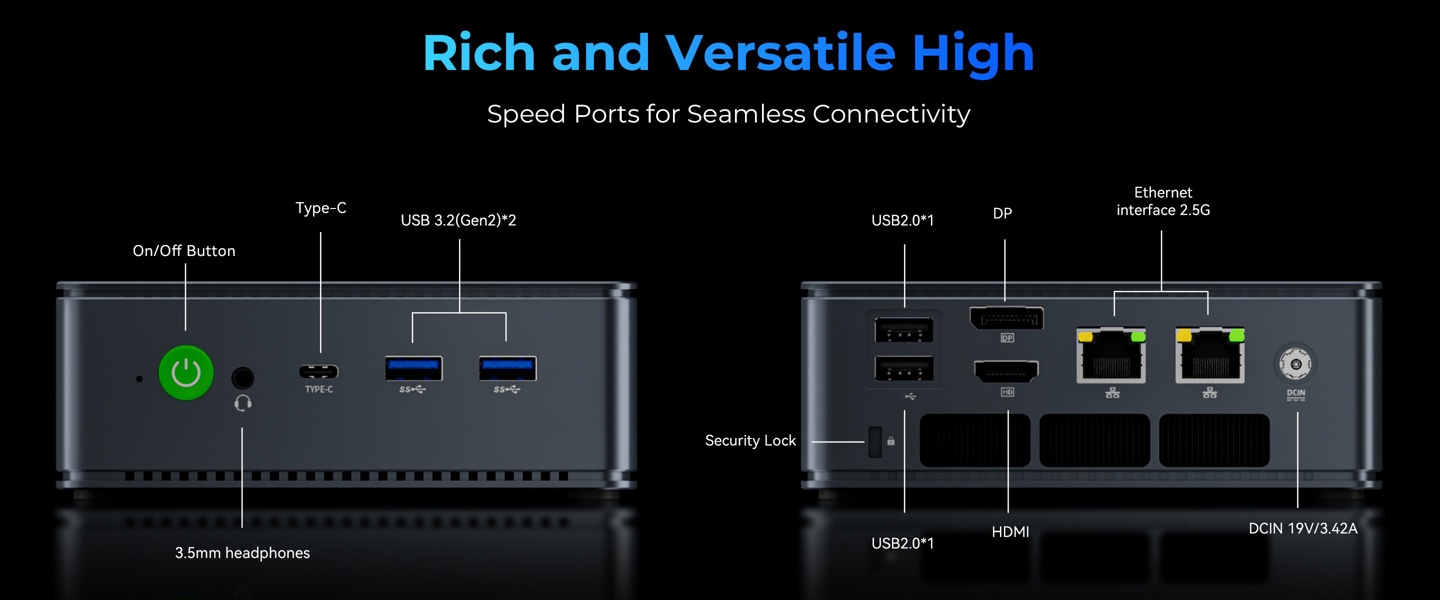 后方:1× 肯辛通 Kensington 安全锁孔、2× USB-A 2.0 (480Mbps)、1× DisplayPort 8K@60Hz、1× HDMI 2.1 4K@60Hz、2× 2.5GbE RJ45、1× 19V DC-in。