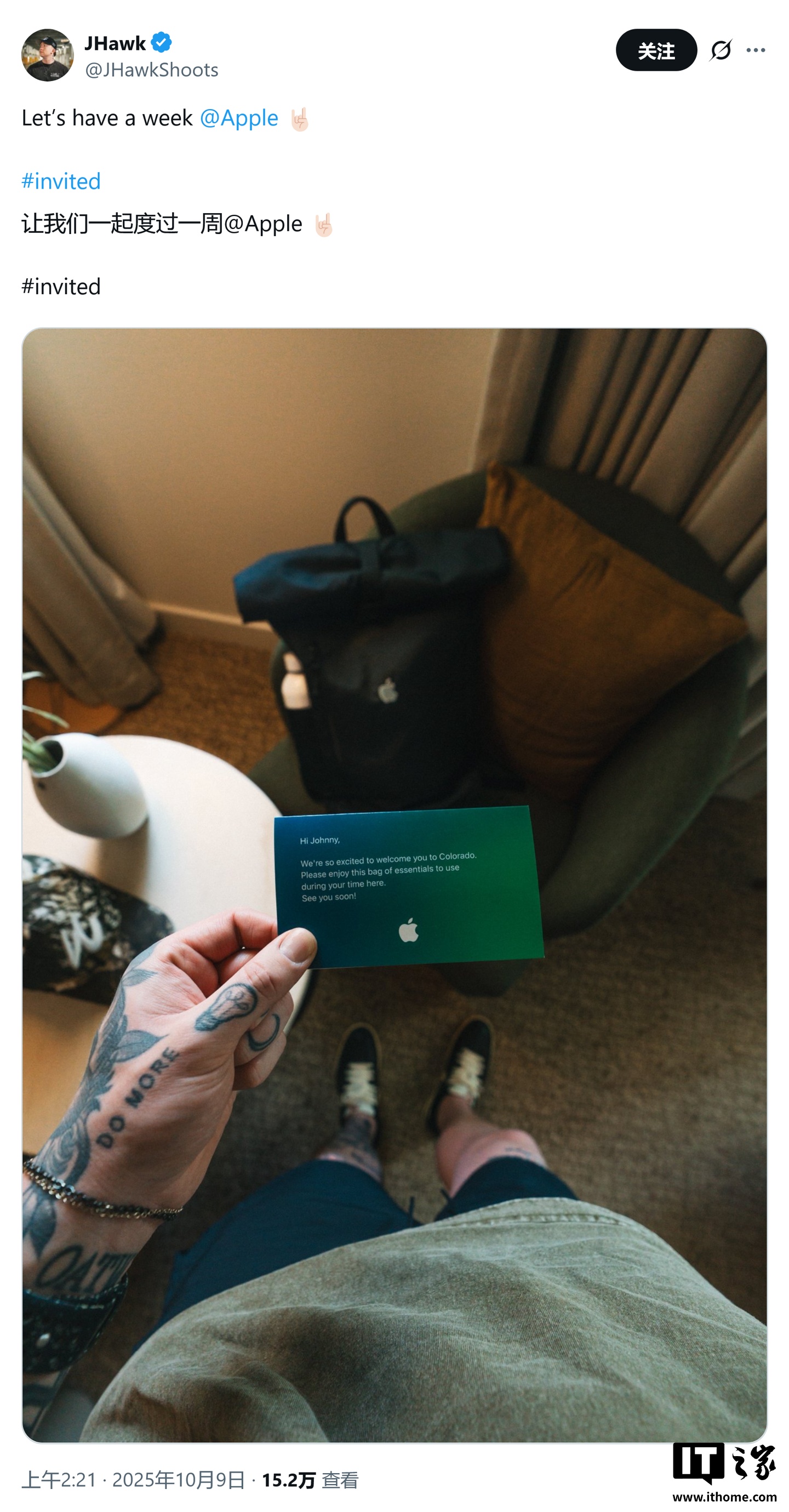 alixixi 10 月 9 日消息,科技媒体 Appleinsider 今天(10 月 9 日)发布博文,报道称苹果邀请 @JHawkShoots 等多位网红科技博主,前往科罗拉多州参加一项未知活动,行程为期 11 天。