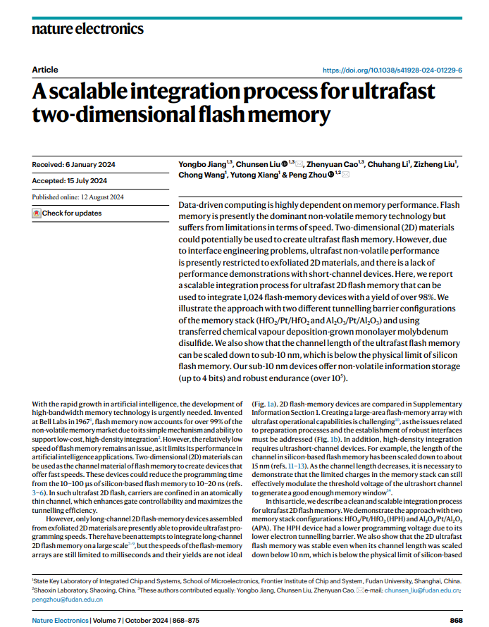 相关研究成果以《全功能二维-硅基混合架构闪存芯片》(A full-featured 2D flash chip enabled by system integration)为题于北京时间 10 月 8 日晚间在《自然》(Nature)期刊上发表。