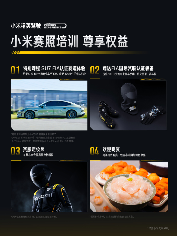 其中,尊享权益包括特别课程 SU7 FIA 认证赛道体验、赠送 FIA 国际汽联认证装备(价值 2000 + 元的专业赛车手套、防火面罩、赛车鞋)、赛服定妆照、欢迎晚宴(高规格欢迎宴,包含小米网红特色单品)。