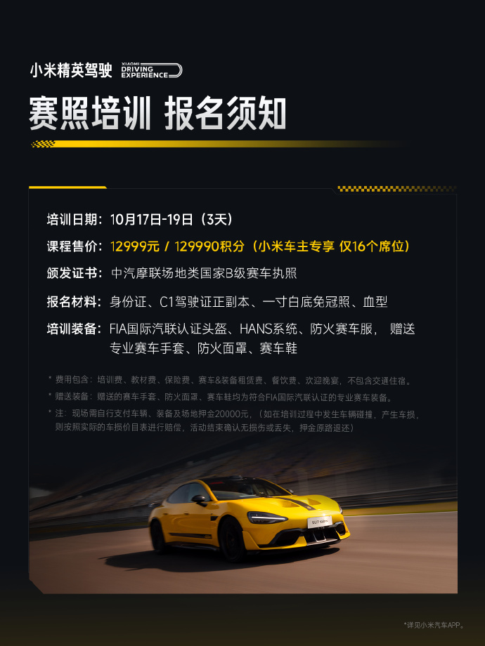 alixixi 10 月 9 日消息,小米汽车今日宣布,小米精英驾驶・赛照培训十月首期,即将开启报名。小米车主专享 16 个席位,还有小米 SU7 赛道体验特别课程等尊享权益。