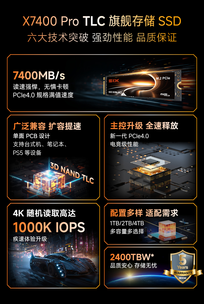 参数方面,赛可驰 X7400Pro 固态硬盘 2TB 版顺序读取速度可达 7422MB/s,顺序写入速度可达 6586MB/s,4K 随机读取速度可达 1000k IOPS,4K 随机写入可达 950k IOPS,耐用性达到 2400TBW ,官方提供 5 年质保。