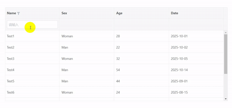 <template> <div> <vxe-grid ref="gridRef" v-bind="gridOptions"> <template #nameFilter="{ option }"> <vxe-input v-model="option.data" clearable @change="updateNameFilterStatus(option)"></vxe-input> </template> <template #nameFloatingFilter="{ option, column }"> <vxe-input v-model="option.data" clearable @change="changeNameFilter(option, column)"></vxe-input> </template> </vxe-grid> </div></template><script setup>import { ref, reactive } from 'vue'import XEUtils from 'xe-utils'const gridRef = ref()const gridOptions = reactive({ border: true, height: 400, filterConfig: { showIcon: true }, floatingFilterConfig: { enabled: true }, columns: [ { field: 'name', title: 'Name', filters: [ { data: '' } ], filterMethod ({ option, row, column }) { if (option.data) { return `${row[column.field]}`.indexOf(option.data) > -1 } return true }, slots: { filter: 'nameFilter', floatingFilter: 'nameFloatingFilter' } }, { field: 'sex', title: 'Sex' }, { field: 'age', title: 'Age' }, { field: 'date', title: 'Date' } ], data: [ { id: 10001, name: 'Test1', role: 'Develop', sex: 'Woman', age: 28, date: '2025-10-01' }, { id: 10002, name: 'Test2', role: 'Test', sex: 'Man', age: 22, date: '2025-10-02' }, { id: 10003, name: 'Test3', role: 'PM', sex: 'Woman', age: 32, date: '2025-10-05' }, { id: 10004, name: 'Test4', role: 'Designer', sex: 'Man', age: 54, date: '2025-10-14' }, { id: 10005, name: 'Test5', role: 'Develop', sex: 'Man', age: 44, date: '2025-09-01' }, { id: 10006, name: 'Test6', role: 'Develop', sex: 'Woman', age: 24, date: '2025-08-15' }, { id: 10007, name: 'Test7', role: 'Test', sex: 'Man', age: 52, date: '2025-11-12' }, { id: 10008, name: 'Test8', role: 'PM', sex: 'Woman', age: 34, date: '2025-11-27' }, { id: 10009, name: 'Test9', role: 'PM', sex: 'Man', age: 24, date: '2025-10-18' }, { id: 100010, name: 'Test10', role: 'Develop', sex: 'Woman', age: 24, date: '2025-10-25' } ]})const updateNameFilterStatus = (option) => { const $grid = gridRef.value if ($grid) { $grid.updateFilterOptionStatus(option, !!option.data) }}// 节流函数、间隔0.5秒触发一次查询const changeNameFilter = XEUtils.debounce((option, column) => { const $grid = gridRef.value if ($grid) { $grid.updateFilterOptionStatus(option, !!option.data) $grid.saveFilter(column) // $table.saveFilterByEvent(new Event('keydown'), column) }}, 500, { leading: false, trailing: true })</script>