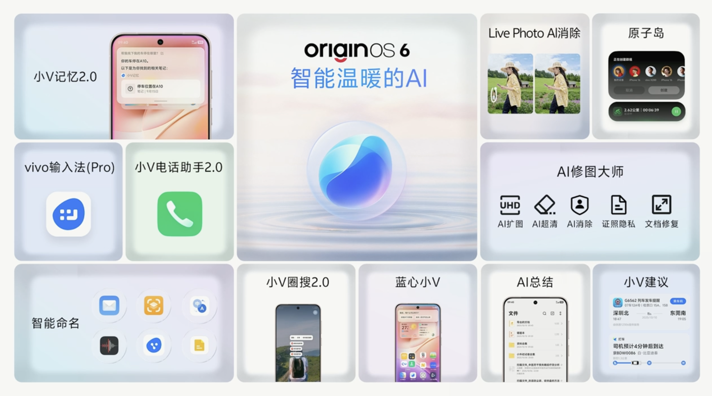 此外,新系统重点对蓝心语言大模型、语音大模型、图像大模型 AI 方面进行升级,能记学习资料、记旅游攻略、记日程、记待办、记地址,重点解决用户日常中 1% 问题。同时实现超拟人音色、定制音色、同声传译、声音记忆。