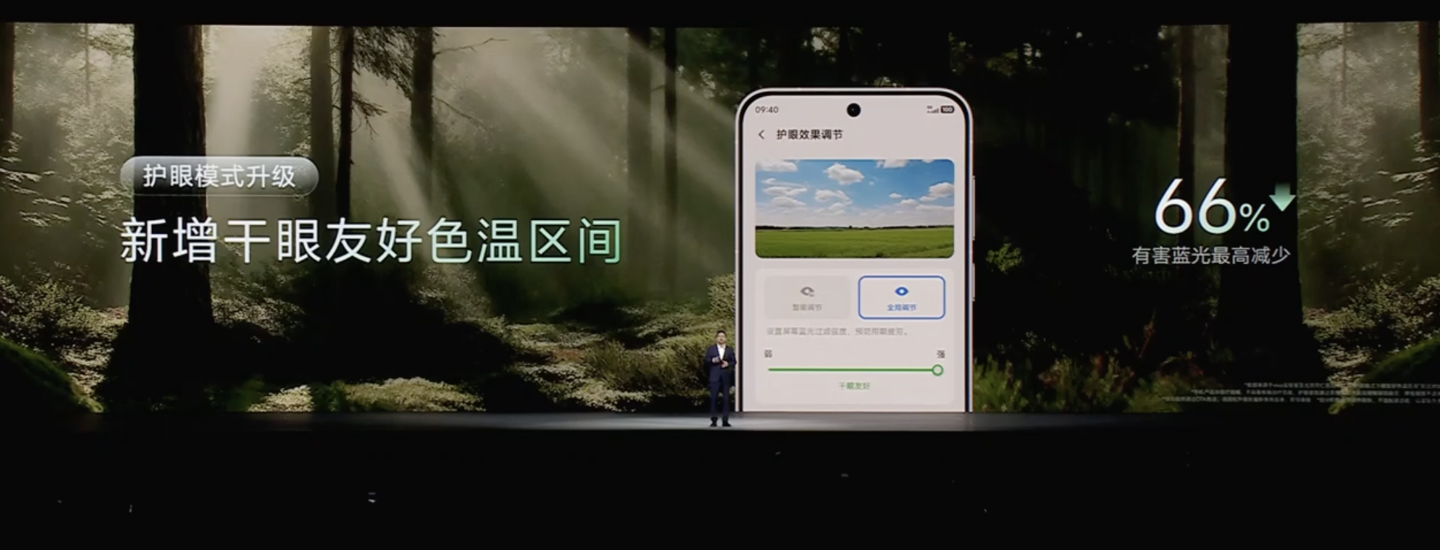 新系统还升级护眼模式,新增干眼友好色温区间,令有害蓝光最高减少 66%,同时系统能够匹配用户作息规律,智能调节屏幕色温,令褪黑素分泌影响减少 25%。支持 AI 全场景仿生亮度功能,并升级加入晕动视觉辅助功能。