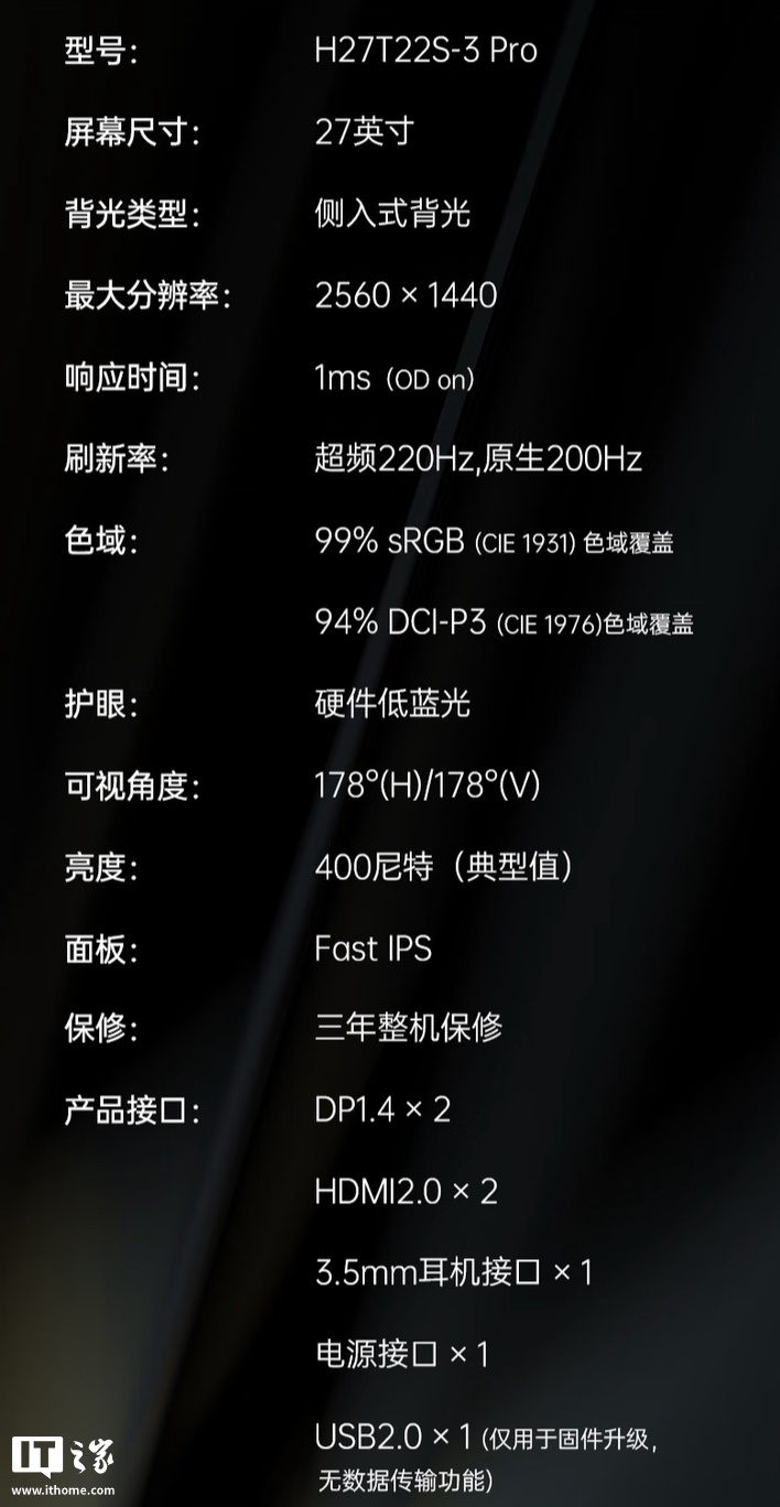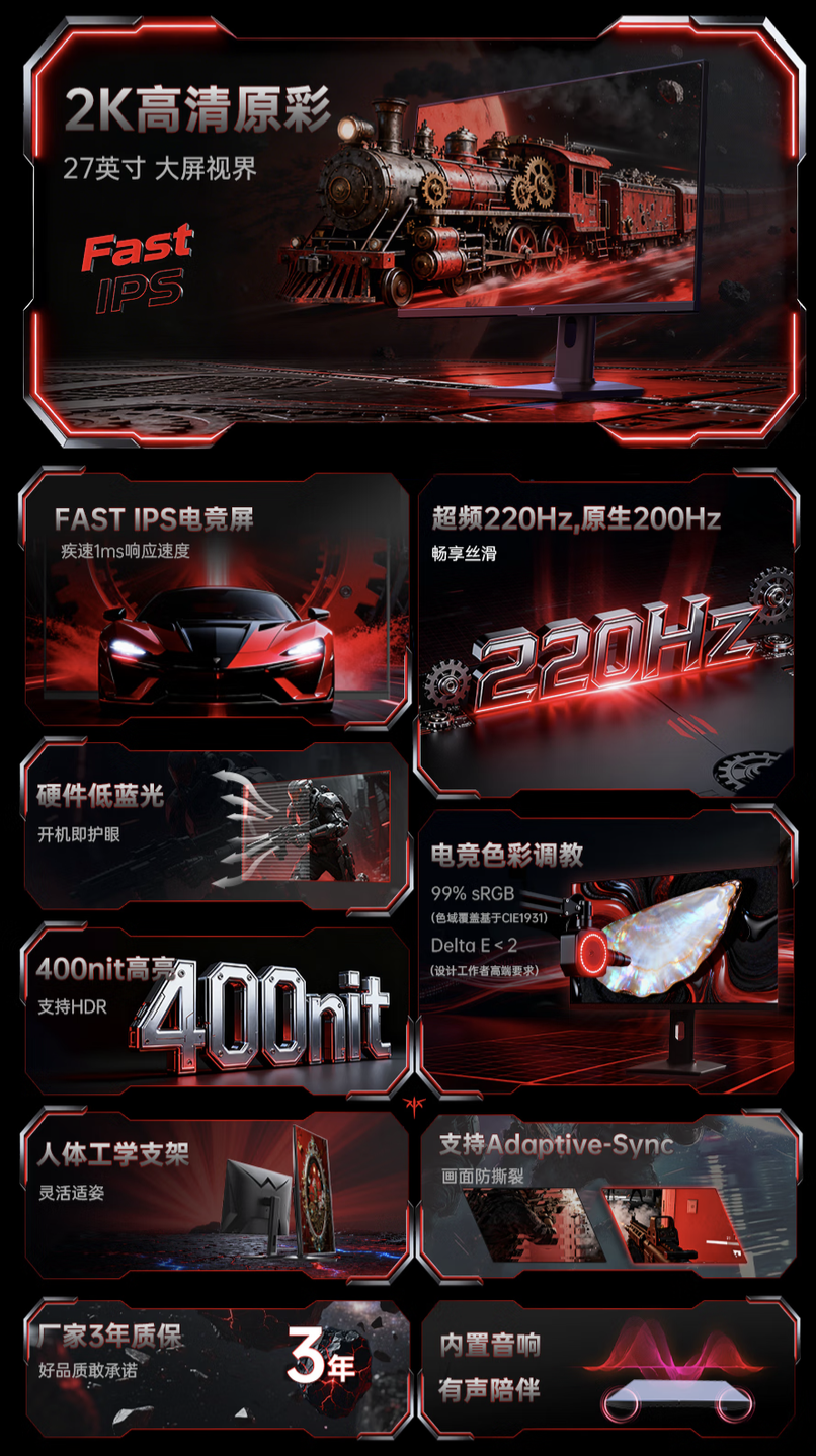 据介绍,这款显示器搭载一块 2560x1440 分辨率 220Hz 超频(原生 200Hz)Fast IPS 面板,亮度 400 尼特,响应速度 1ms,覆盖 99% sRGB、94% DCI-P3 色域。