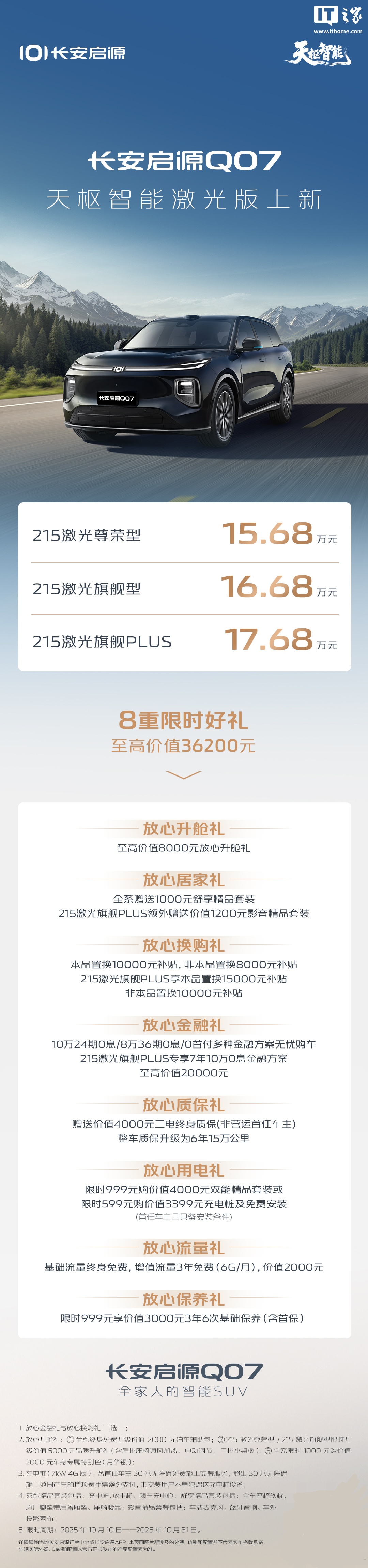 alixixi 10 月 10 日消息,长安启源 Q07 天枢智能激光版汽车今日正式上市,定价 15.68 万元起,比原版贵了 5000 元。