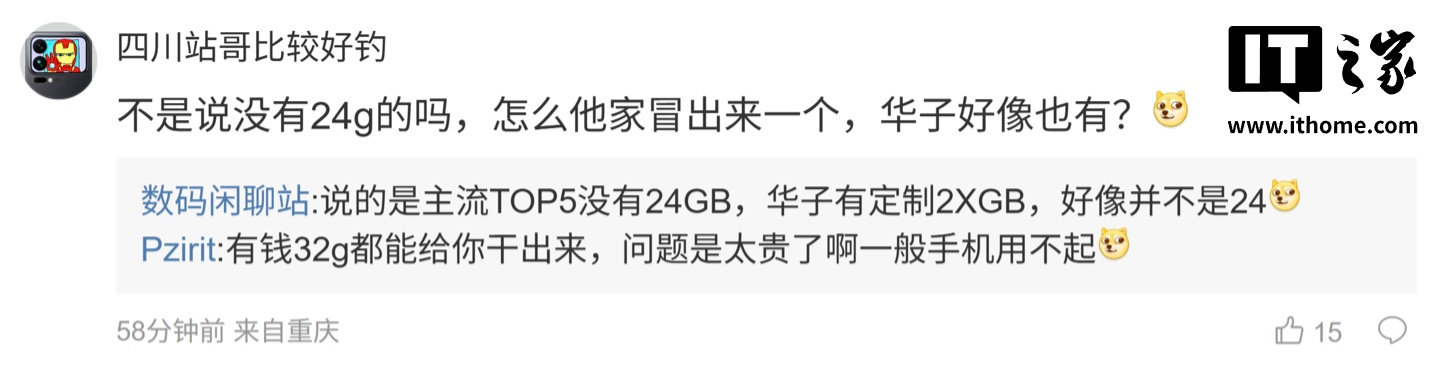 后续有用户在评论区询问:“不是说没有 24g 的吗,怎么他家冒出来一个,华子好像也有?”,博主回复道:“说的是主流 TOP5 没有 24GB,华子有定制 2XGB,好像并不是 24