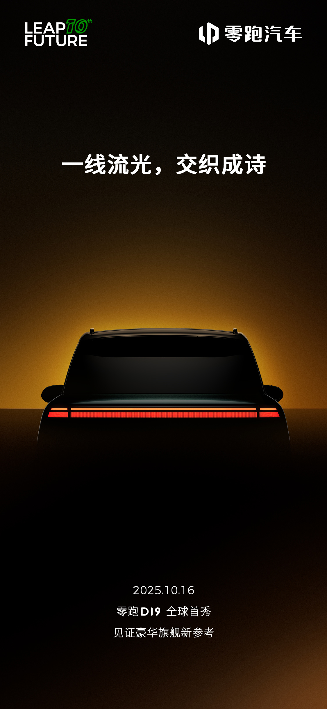 alixixi 10 月 10 日消息,今天上午,零跑汽车公布了豪华旗舰 SUV 新车 —— D19 的两张预告图,展示这款新车的车头、车尾视角。新车车顶配有激光雷达,并搭载尺寸较大的贯穿式前后灯,官方称为“光迹流转”和“一线流光”。