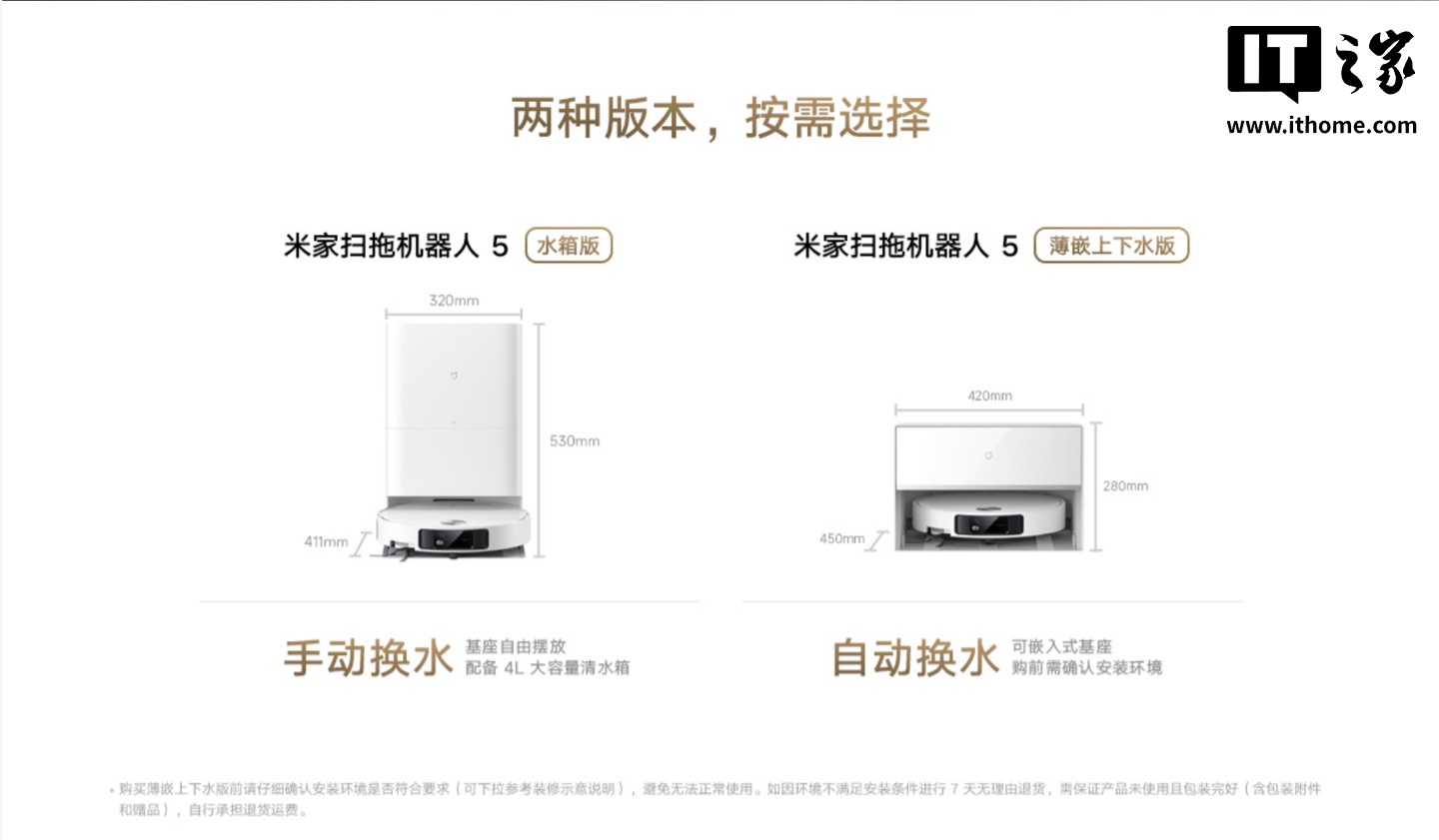 alixixi 10 月 10 日消息,小米米家扫拖机器人 5 现已开启新品预约,主打 7.9cm 超薄机身、AI 识别障碍物,越障高度可达 40mm,有水箱版和薄嵌上下水版,售价 3199 元起。
