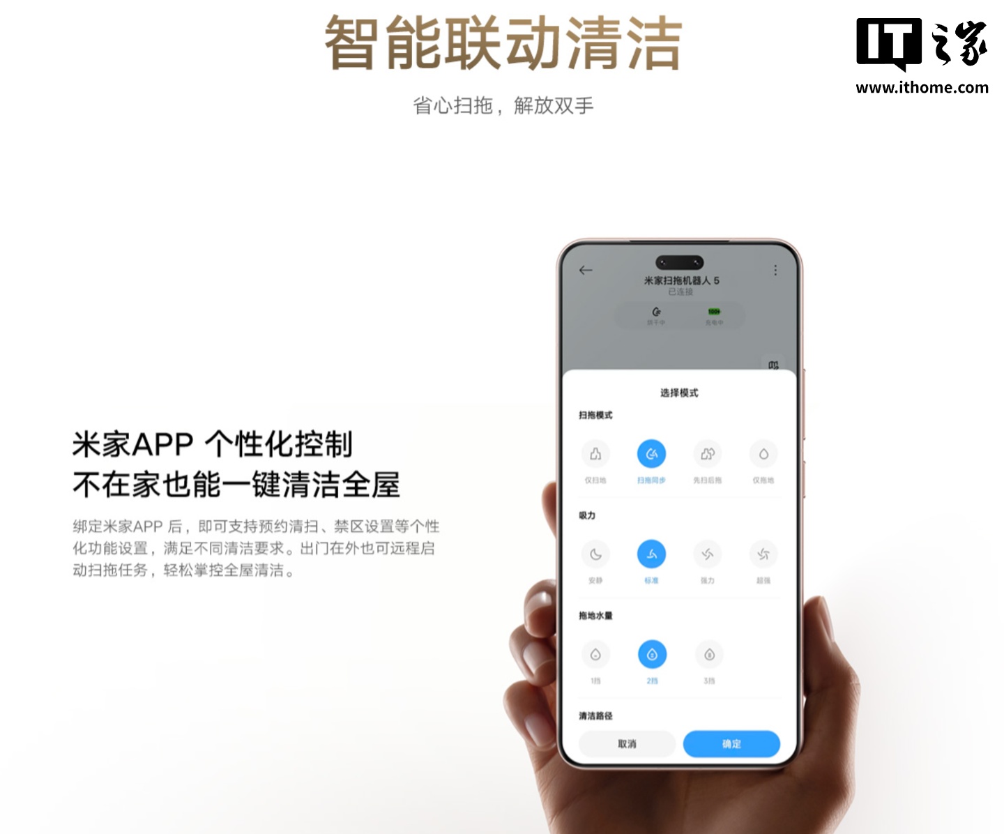 此外,这款扫拖机器人还支持米家生态和小米澎湃互联,使用米家 App 即可预约清扫、设置禁区等,出门在外时也可以远程启动机器人,也可与小米生态链的门锁、空气净化器、加湿器等设备联动,自行打造专属清洁场景。