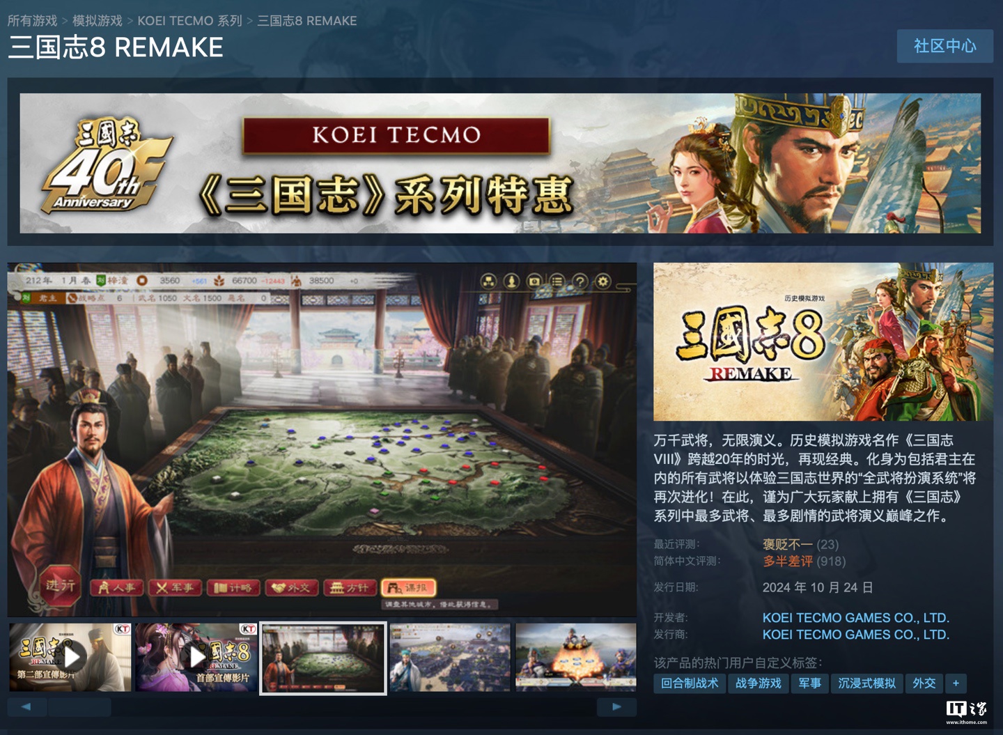 作为比较,《三国志 8 REMAKE》是以 2001 年发售的历史模拟游戏《三国志 8 威力加强版》为基础做的重制版,已于去年 10 月 24 日在 Steam 平台发售,国区 349 元起(现 6 折后到手价 209.4 元起),截至alixixi发稿,本作好评率 48%“褒贬不一”,简体中文评测 36%“多半差评”,商品页面(https://store.steampowered.com/app/2288150/8__REMAKE/?l=schinese)。