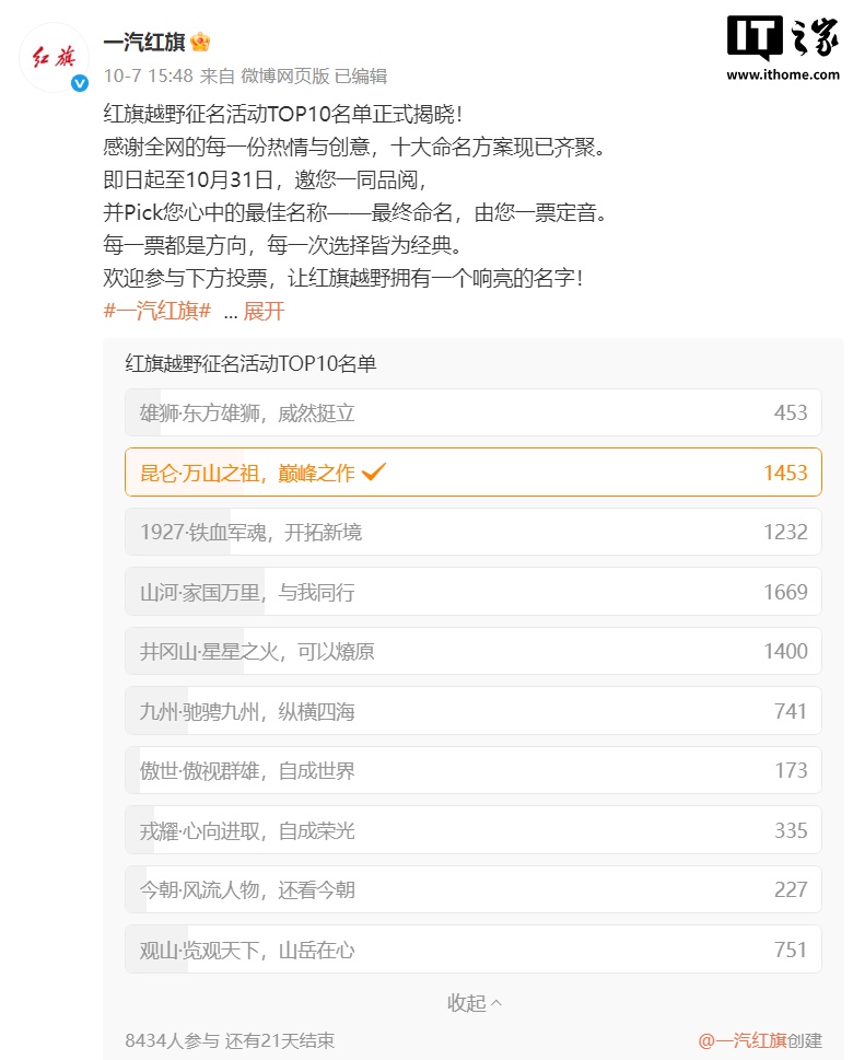 从一汽红旗官方发起的投票来看,截至alixixi发文,“山河”的得票率最高,“昆仑”“井冈山”紧随其后。