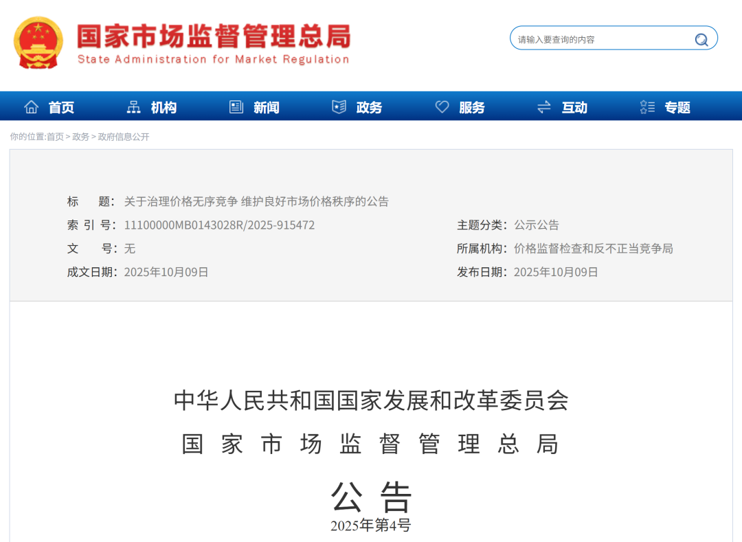 10月9日,国家发展改革委、市场监管总局发布《关于治理价格无序竞争 维护良好市场价格秩序的公告》。