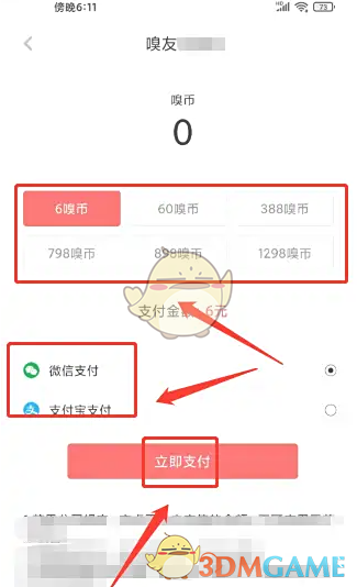 4、进入我的嗅币,选择充值金额、支付方式,点击【立即支付】。