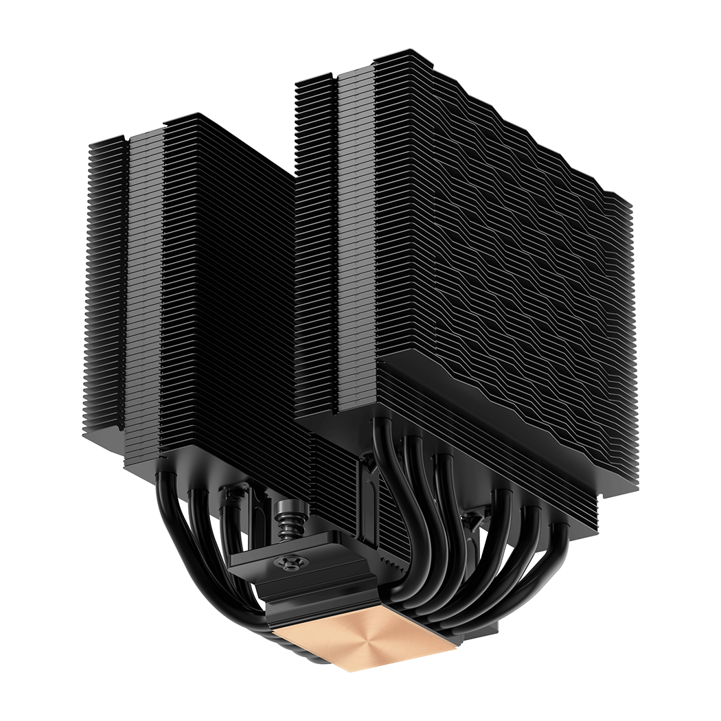 RT620Pro TC ARGB 构型为双塔双风扇六热管铜底,包含 6 根双向重力优化的 6mm 直径热管、三角几何交错降噪鳍片矩阵,鳍片外缘采用折 Fin 工艺,原色铜底以回流焊工艺与塔体集成。