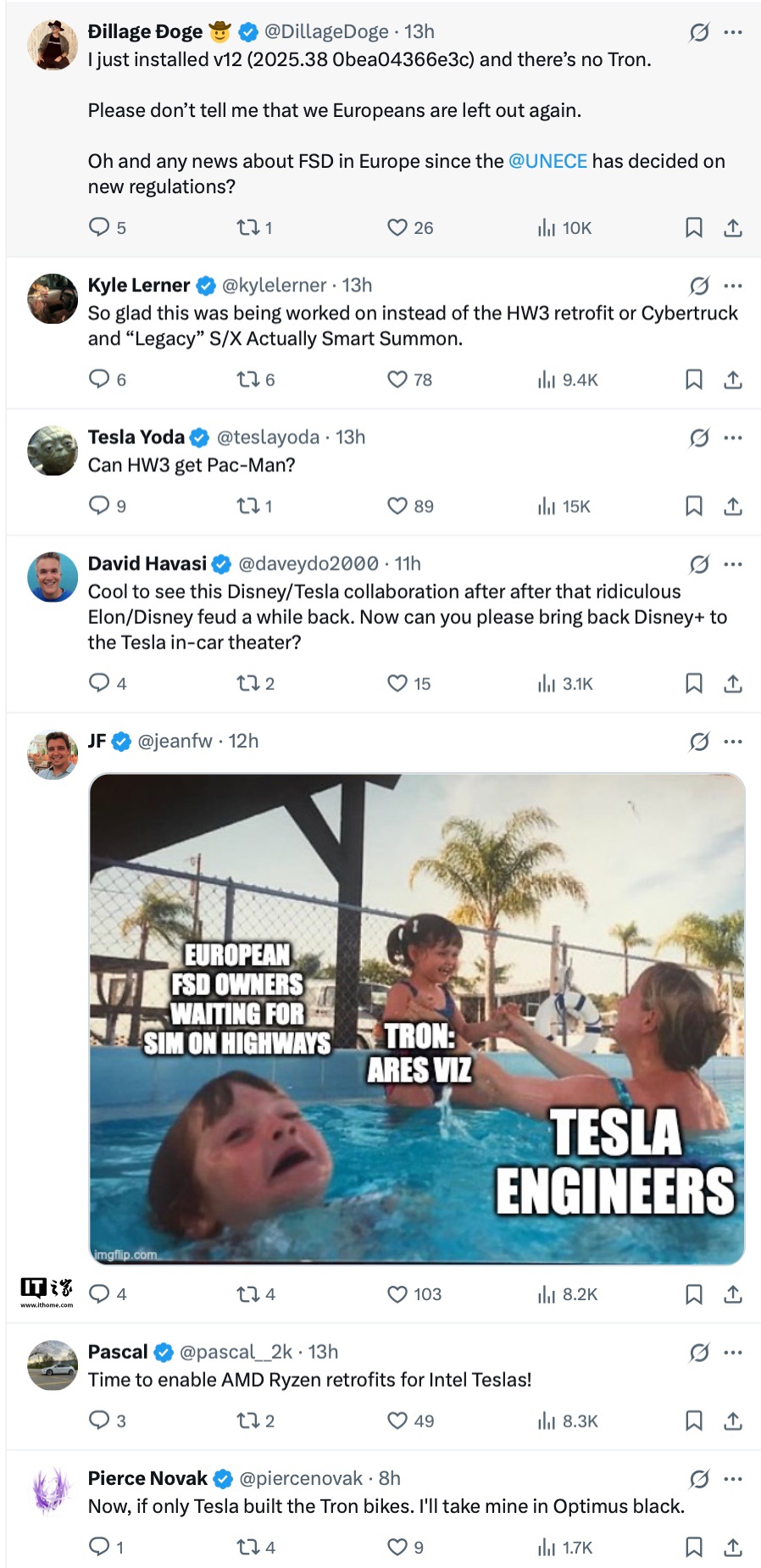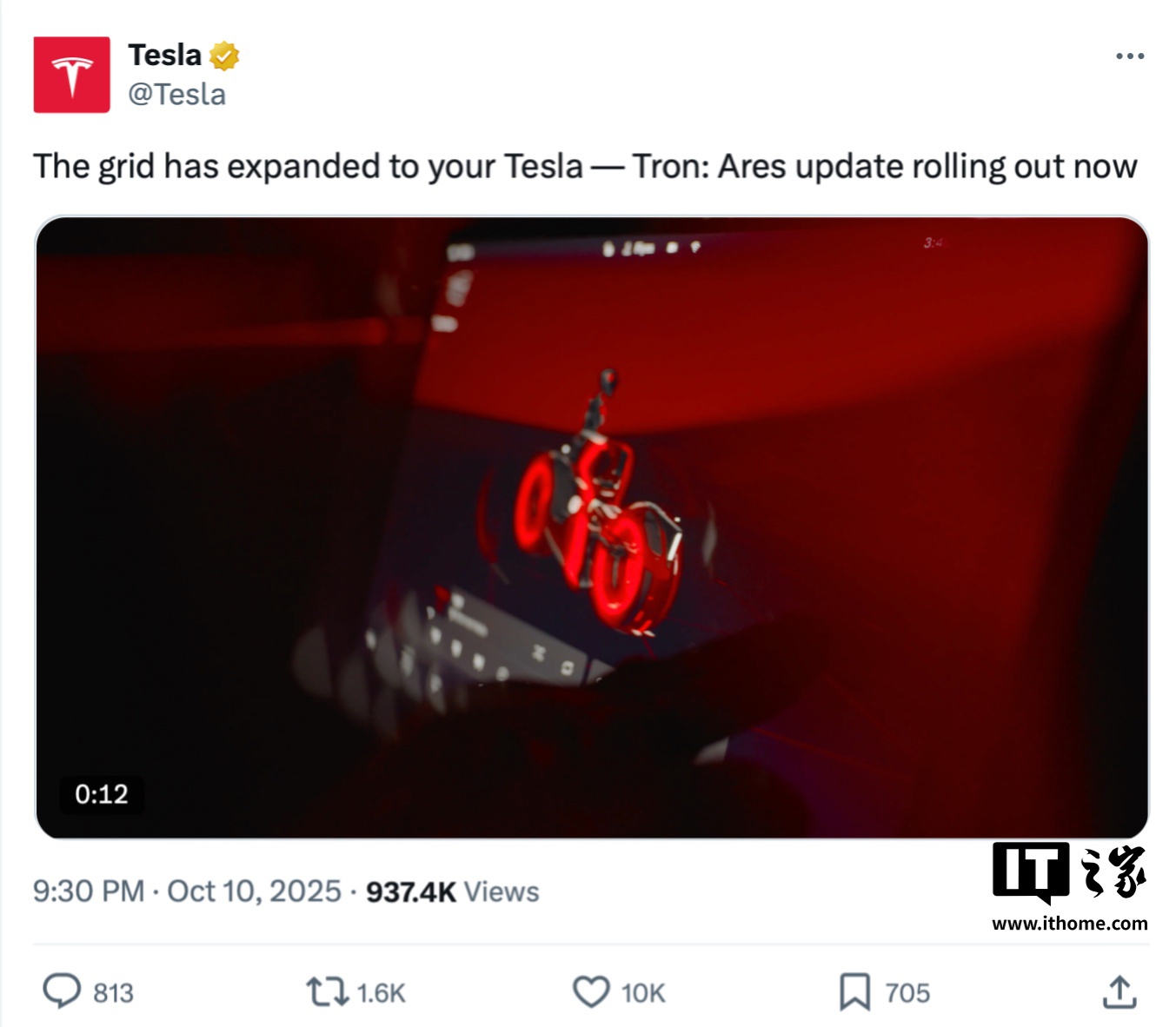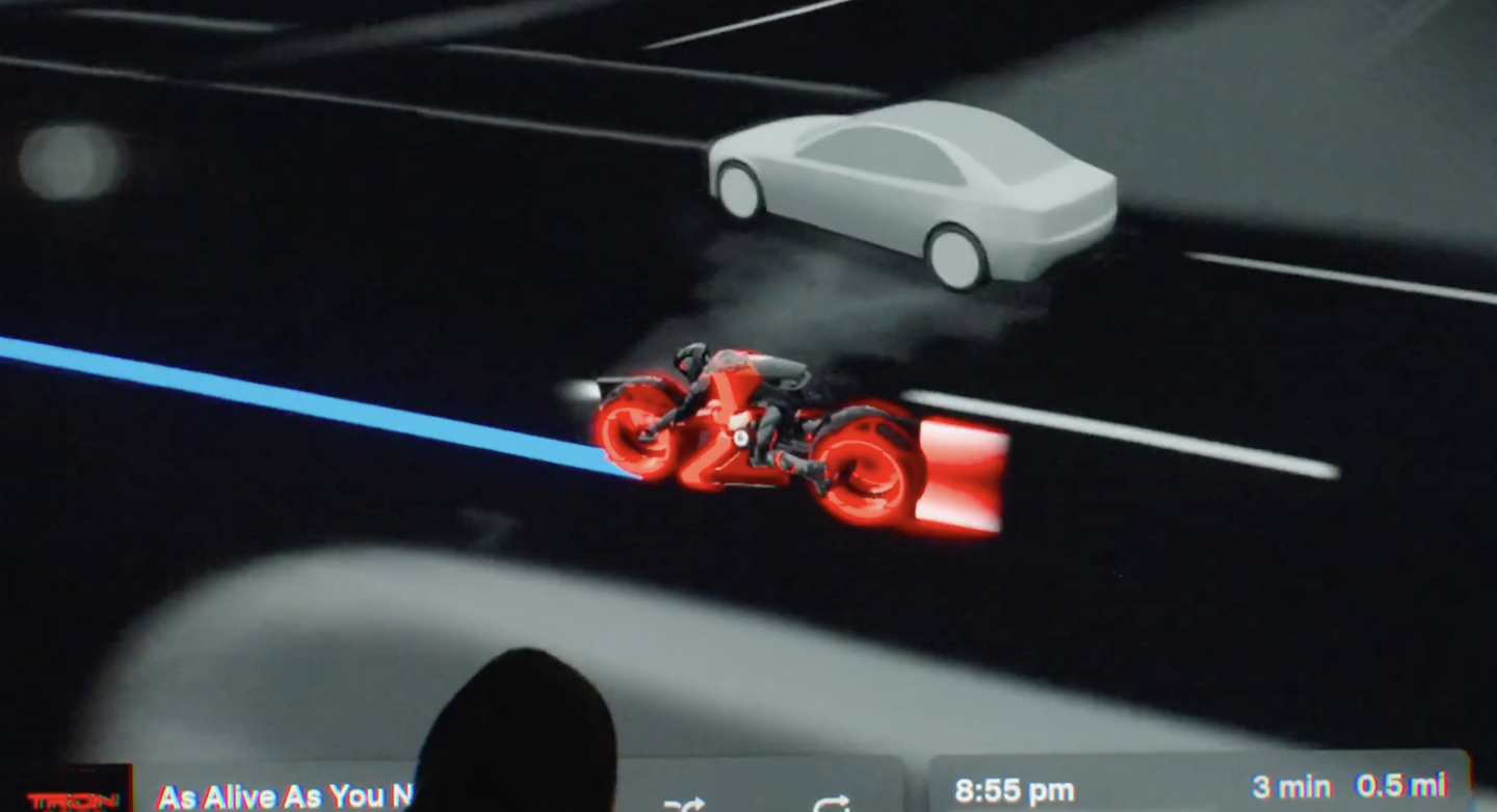 alixixi 10 月 11 日消息,据 electrek 报道,特斯拉近日与昔日“对手”迪士尼达成合作,向海外车型推送更新,允许车主将自己中控上的虚拟 3D 车模修改为电影《创:战神(Tron: Ares)》的未来摩托车,以此宣传相应电影。