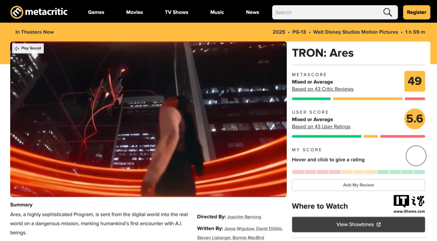 公开信息显示,《创:战神》为 2010 年电影《创:战纪》的独立续集,今天正式在美国市场上映,截至alixixi发稿,这部电影在烂番茄上拥有 160 条评论,获得 56% 的新鲜度,在 Metacritic 上,本片获得 49 分。