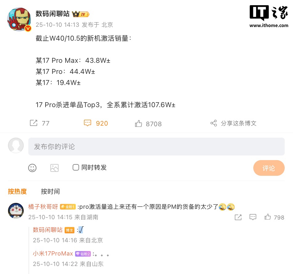 alixixi注意到,该博主同样透露“截止 W40/10.5”新机激活销量榜中,“某 17 Pro Max”达 43.8W±、“某 17 Pro”达 44.4W±、“某 17”达 19.4W±,并表示 17 Pro 杀进单品 Top3,全系累计激活 107.6W±。综合评论区,预计相应机型为小米 17 系列手机。