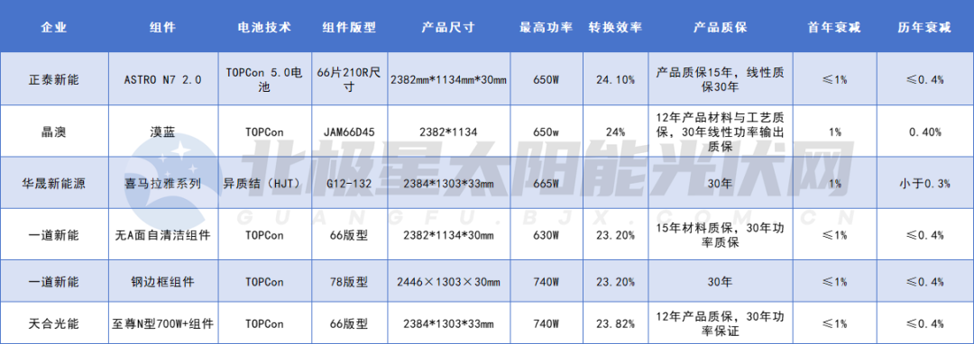 从组件规格来看,参与沙戈荒项目组件的转换效率基本在23.2%及以上,效率最高的是正泰新能组件ASTRO N7 2.0组件,效率为24.1%;功率方面,66版型最高功率是天合光能至尊N型组件,达到740W;组件首年衰减不高于1%,历年衰减在0.3%~0.4%,各企业相当;质保方面,产品材料质保在15年,线性功率质保30年。